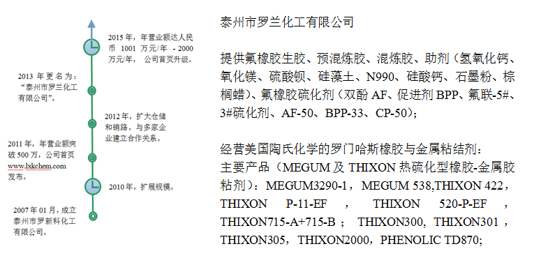 泰州市羅蘭化工有限公司向您提供氟橡膠生膠、預(yù)混煉膠、混煉膠、助劑(氫氧化鈣、氧化鎂、硫酸鋇、硅藻土、N990、硅酸鈣、石墨粉、棕櫚蠟)、氟橡膠硫化劑(雙酚AF、促進劑BPP、氟聯(lián)-5#、3#硫化劑、AF-50、BPP-33、CP-50);經(jīng)營美國陶氏化學的羅門哈斯橡膠與金屬粘結(jié)劑,主要產(chǎn)品(MEGUM及THIXON熱硫化型橡膠-金屬膠粘劑):MEGUM3290-1,MEGUM 538,THIXON 422,THIXON P-11-EF,THIXON 520-P-EF,THIXON715-A+715-B;THIXON300,THIXON301,THIXON305,THIXON2000,PHENOLIC TD870;